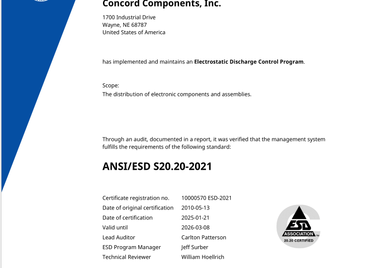ISO 9001 : 2015 Certificate of ISO 9001 : 2015 AS9120:2016 Certificate of AS9120:2016 ANSI/ESD S20.20-2021 Certifications List of our Accreditations AS9120ISO 9001ESD2020ERAIGIDEPWOSBQSLD/QTSLDLA/DCMA